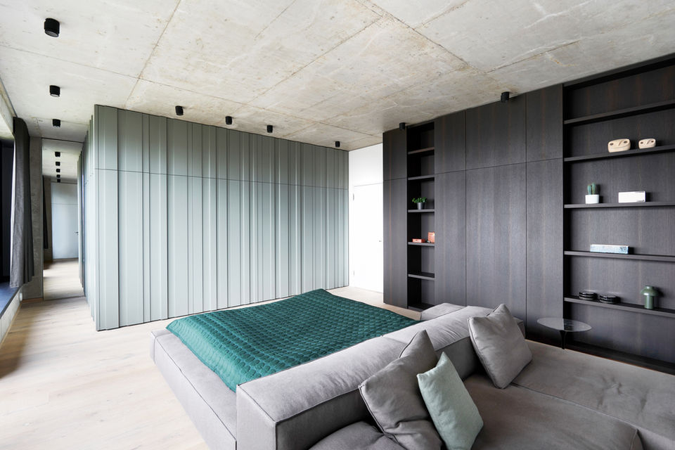 In der unteren Etage haben wir einen Lounge-, Bibliotheks-, Assistenz- und Konferenzbereich, eine Büroküche und zwei separate Arbeitsplätze geplant und umgesetzt. In die zweite Etage führt eine, über einem Sideboard aus Douglasienholz schwebende, filigrane schwarze Stahltreppe. Im Wohnbereich mit Liegeinsel sind Bad und Miniküche sowie großzügiger Stauraum in einem detailliert gestalteten grünen Kubus versteckt. Hier lässt sich der Ausblick auf den Berliner Fernsehturm und den Besselpark bestens genießen.